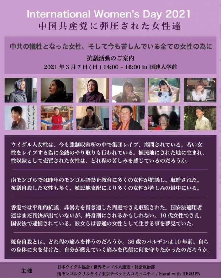 3月8日は国際女性デーです。国際社会が女性の自由と平等のために努力している中で、忘れ去られている女性達がいます。中国の圧政下にある、ウイグル人、チベット人、南モンゴル人、香港人の女性達です。彼女達は、長年中国共産党により、計画的な弾圧や虐殺にあってきました。彼女達の自由と人権を求める声無き声を、日本にいる私たちが世界に訴えていきましょう。 日本にいる各民族の皆様、支援してくださる日本人の皆様、どうぞお集り頂き、共に声をあげてください。