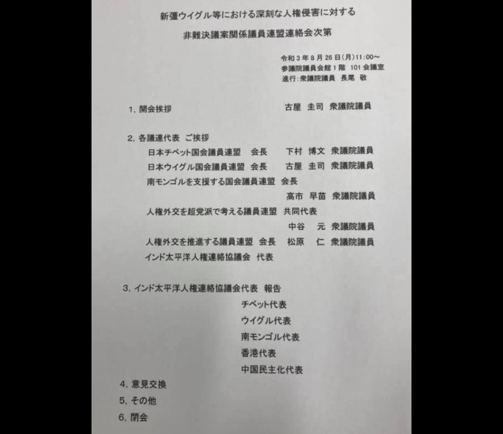 8/26、衆議院第二議員会館に新疆ウイグル等における深刻な人権侵害に対する非難決議案関係議員連盟連絡会を行い、 チベット議連・ウイグル議連・南モンゴル議連・2つの人権外交議連と南モンゴル・ウイグル・チベット・ 香港など13の民族団体と民族支援団体が会議に参加した。